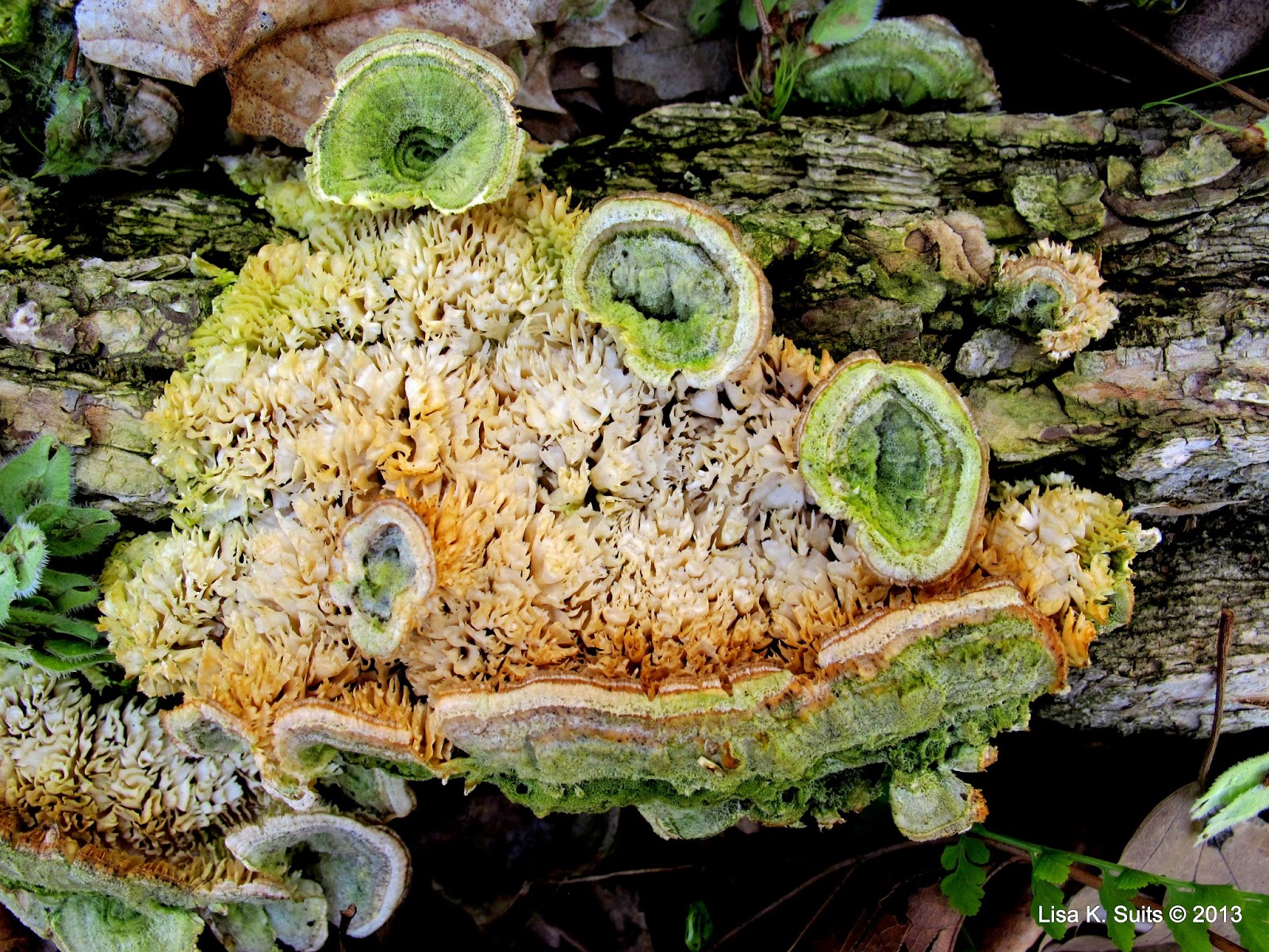 Below: Lenzites betulina that grew, then the log rolled over and it grew some more and tropism led to wild growth patterns (normally it’s your basic shelf/shell shape), and then algae grew on it. When fresh it actually has gills, but this one's been banged around in life and the gills are shredded. Also, many other people's images show algae growing on it too.