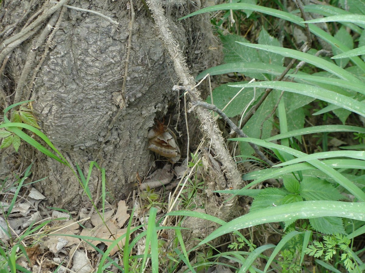 I wanted to hike to a different spot, and I went back to the car to regroup. It was too warm to leave it in the car, and too dangerous for the cocoon to drag it around in my shirt pocket, so I found a nearby tree and laid it on the ground nearby, out of sight. I came back a half-hour later and it had emerged!